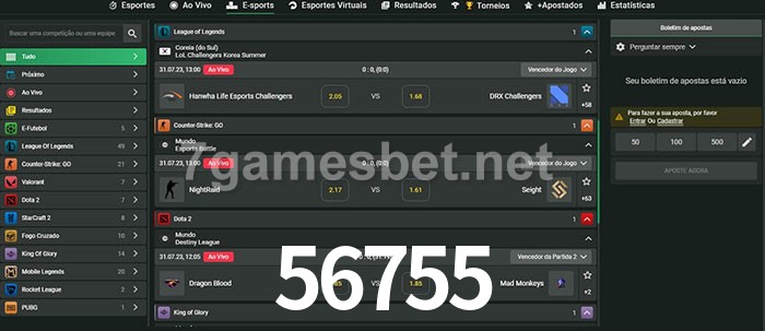 O 56755 oferece uma grande seleção de opções de apostas em e-sports com probabilidades competitivas